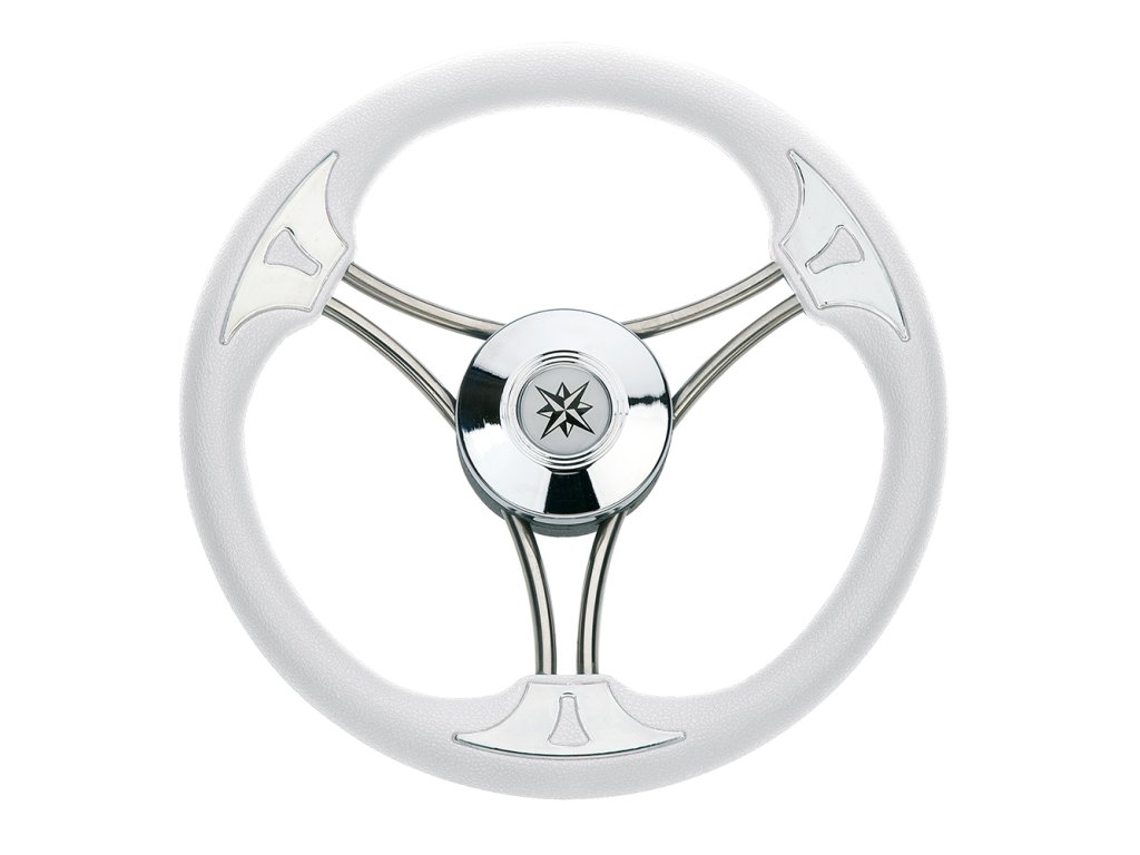 Bílý polyuretanový volant s 3 dvojitými nerezovými paprsky a chromovaným vložkami na úchytu, průměr 35 cm