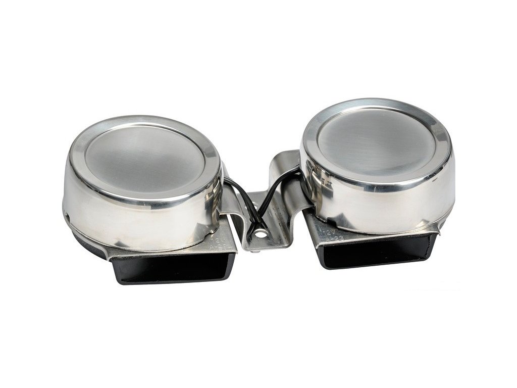 Dvojitá nerezová lodní houkačka na 12 V. Rozměr 110 (délka) x 100 (šířka) mm. Váha 400 g. 105 db.Doplňkové parametry