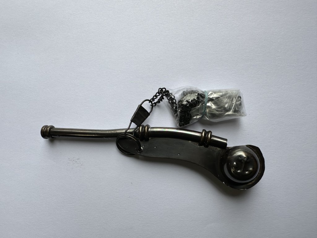 • Tvar a materiál: Bootsmanová píšťalka je obvykle vyrobena z kovu, jako je mosaz nebo stříbro, a má charakteristický tvar s dlouhou úzkou trubicí a kulovou částí na konci.