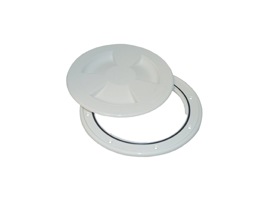 Kulaté inspekční víko v bílé barvě s těsnícím kroužkem na bajonetový uzávěr, vnitřní průměr 130 mm
