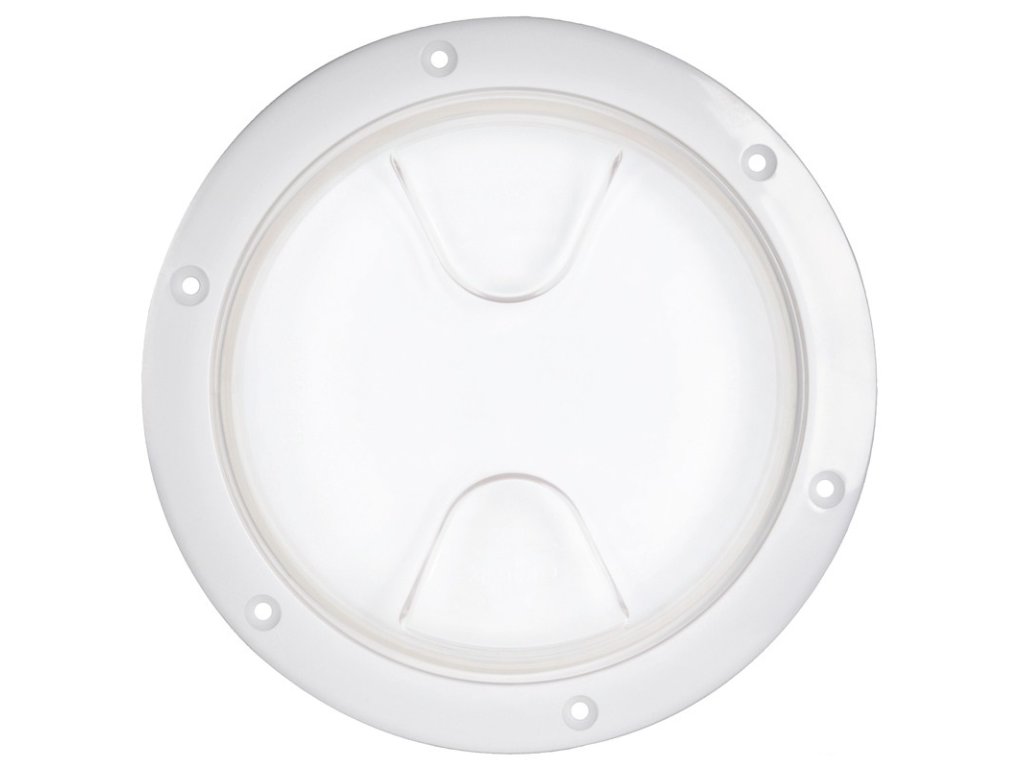 Kulaté šroubovací průhledné inspekční víko s bílým rámečkem a těsnícím kroužkem, vnitřní průměr 125 mm