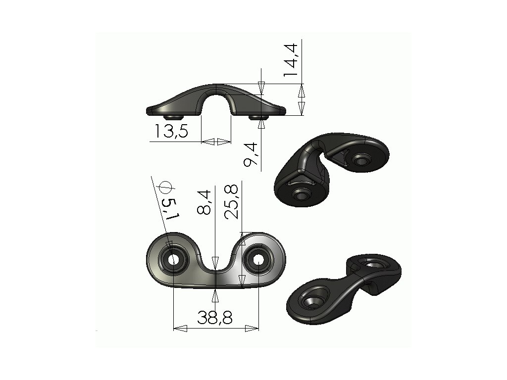 Nadprůchodka pro velkou svorku. Nadprůchodka je užitečný doplněk pro svorky velké. Má dvě rovnocenné funkce: 1. navádí lano ke svorce a udržuje ho v blízkosti čelistí, zejména při vysekávání lana, 2. svorku vyztužuje, čím zlepšuje její funkčnost. Nadprůchodka se napojuje na svorku velkou pomocí šroubů M5 se zapušťenou hlavou. Nadprůchodka je vyrobena z kompozitního termoplastu PA66 vyztuženého 30% skelných vláknen, což zvyšuje (ve srovnání s neplněným PA) její pevnost a tuhost. Součást je odhlečena ve spodní části doléhající na svorku (viz. nákres). Nadprůchodka je vyrobena na automatickém vstřikovacím lise.Buďte první, kdo napíše příspěvek k této položce.