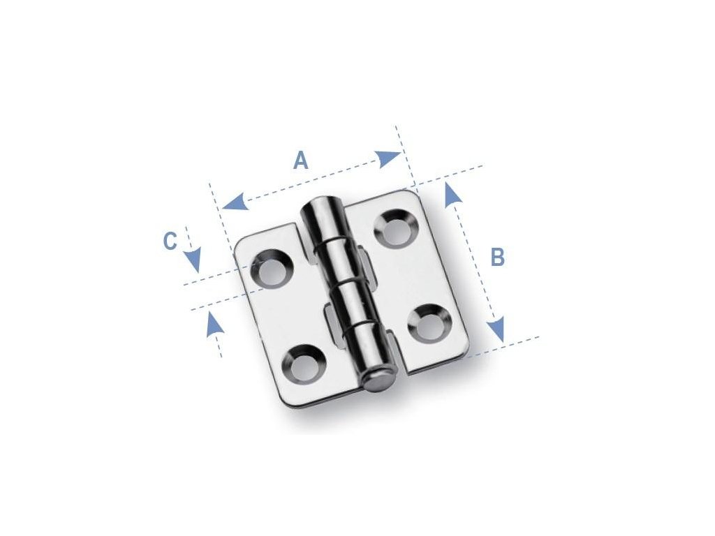 Nerezový čtvercový pant, rozměr 38,5 x 40 a 48 x 40 mm. Průměr děr 5 mm (C). Šířka 2 mm.Doplňkové parametry