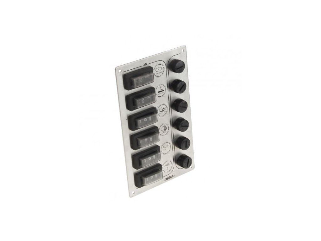 Nerezový panel se 6 přepínači včetně pojistek pro 12/24 V. Maximální proud na jeden vypínač je 10 A. Vyrobeno z nerezové oceli Inox 316.Doplňkové parametry
