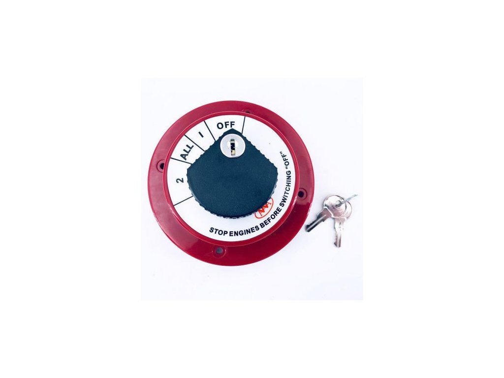 Odpojovač baterie na klíček pro 2 baterie. Celkový průměr 140 mm, výška 56 mm. Určeno špičkově pro 360A, průběžně 250A. Určeno pro 12V.