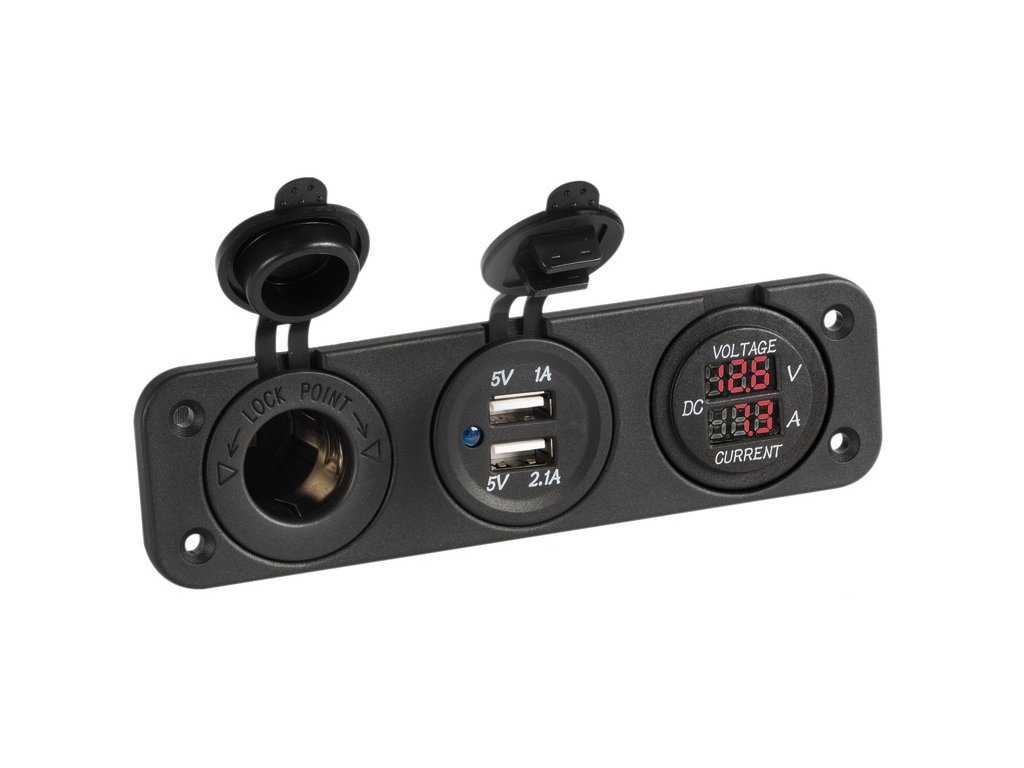 Panel s digitálním voltmetrem 8/32V, ampermetrem 0/10A, 12V zásuvkou a dvojitou USB (2,1 a 1,0 A).Doplňkové parametry