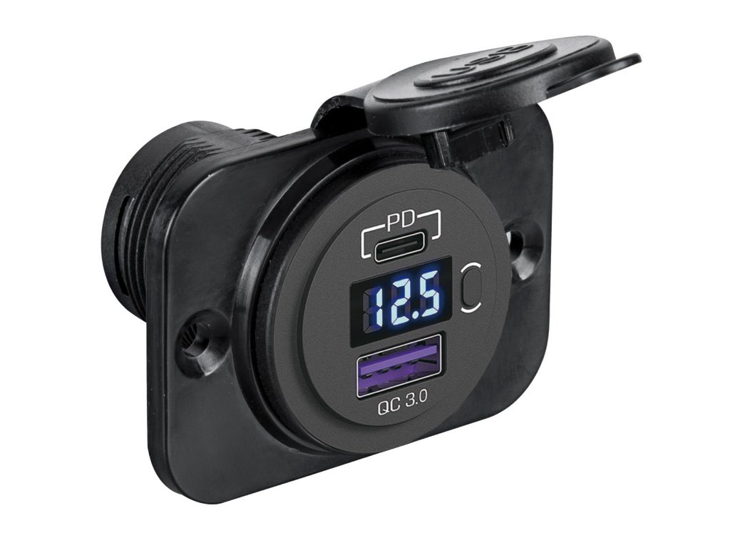 Voltmetr s rozmezím 8/32V. USB zásuvka s USB-C a USB-A - 3+3A. Určeno pro zabudovanou montáž.