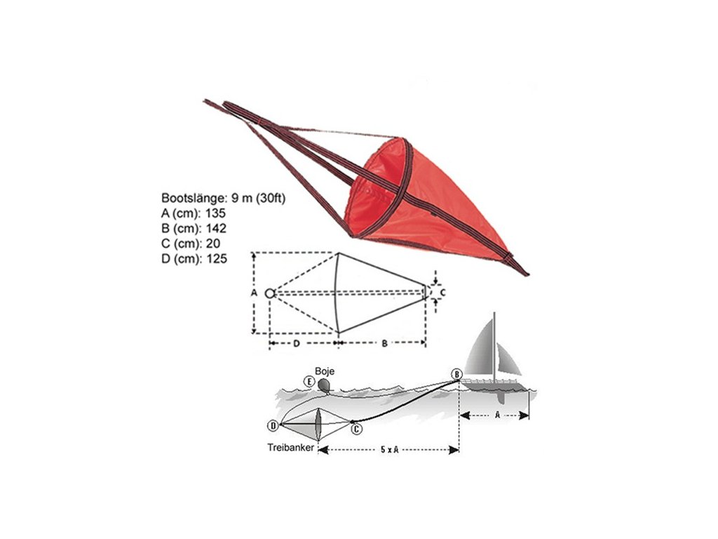 Plovoucí kotva pro lodě do délky 12 m (40 ft). Rozměr 190 cm (A) x 145 cm (B) x 20 cm (C) x 130 cm (D).