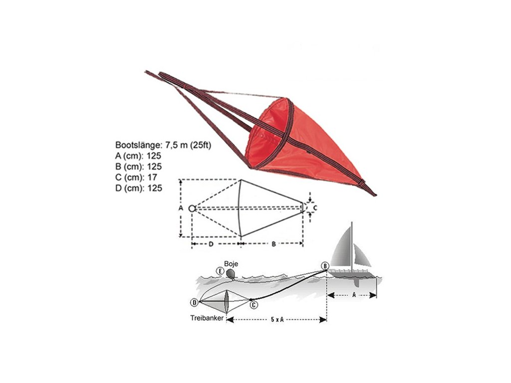 Plovoucí kotva pro lodě do délky 7,5 m (25 ft). Rozměr 125 cm (A) x 125 cm (B) x 17 cm (C) x 125 cm (D).