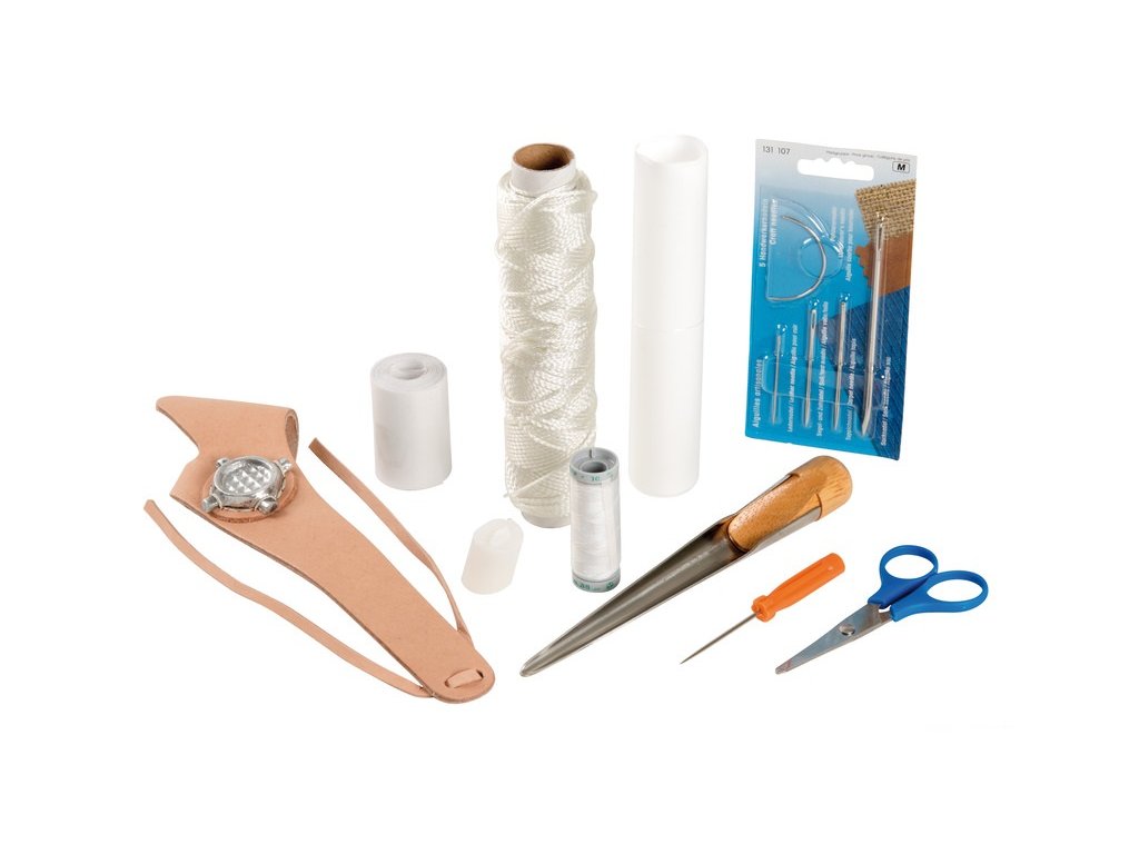 Sada obsahuje: 2 cívky polyesterové nitě; 1 kus parafínu na nit; nůžky; 5 jehel; 2,5 metru samolepícího Dacronu; 1 chránič dlaně; 1 čtverec látky Dacron; 1 šídlo. Vše v praktické plastové dóze.