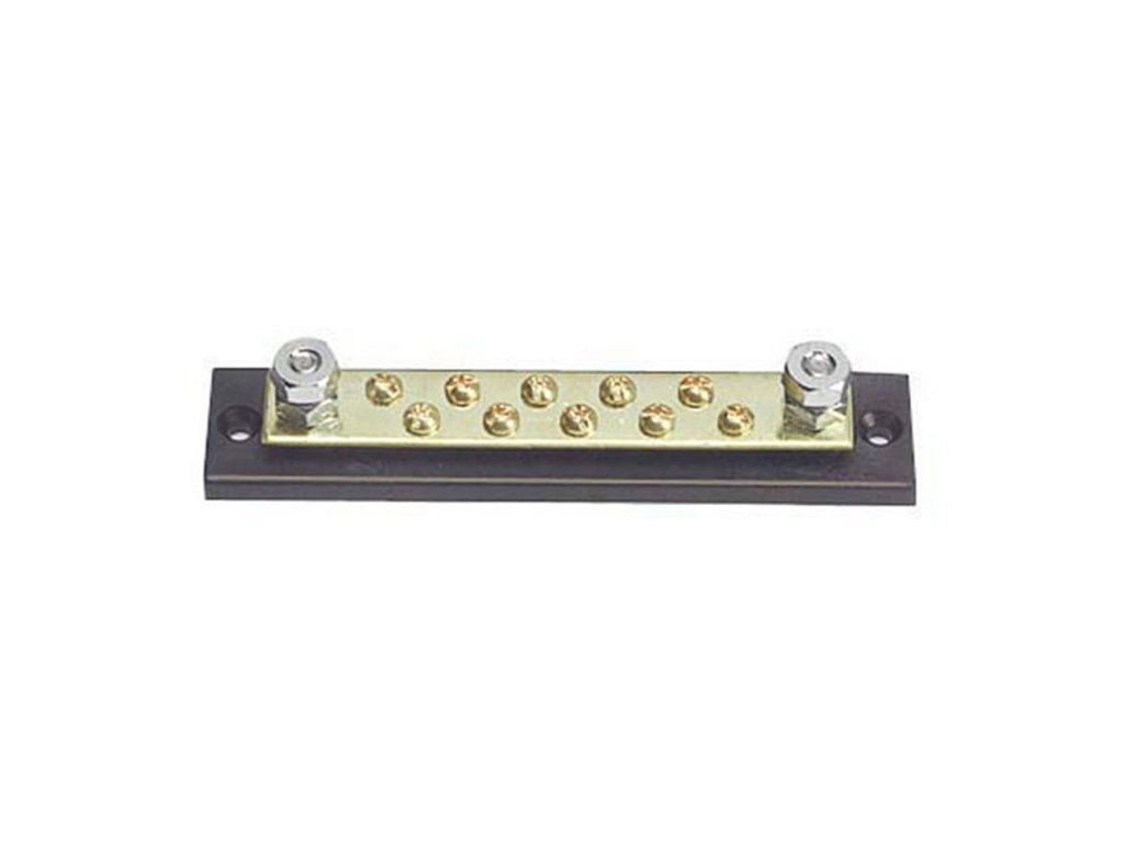 Svorkovnice 10 x 4 mm a 2 x 6 mm. Vyrobeno z poniklované mědi, šrouby z nerezové oceli. Rozměr 145 x 31 mm. Max. 150 A.Doplňkové parametry