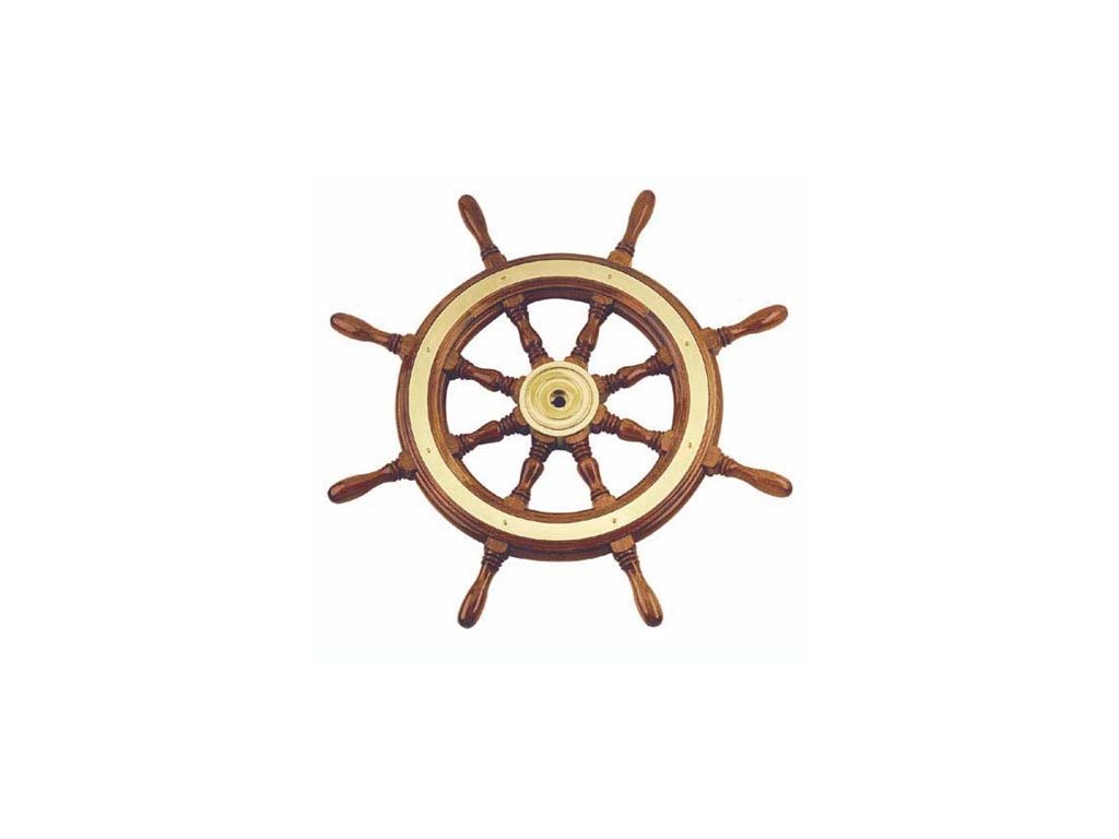 Mahagonové kormidelní kolo s nábojem a lemem z leštěného bronzu, průměr 300 - 800 mm.