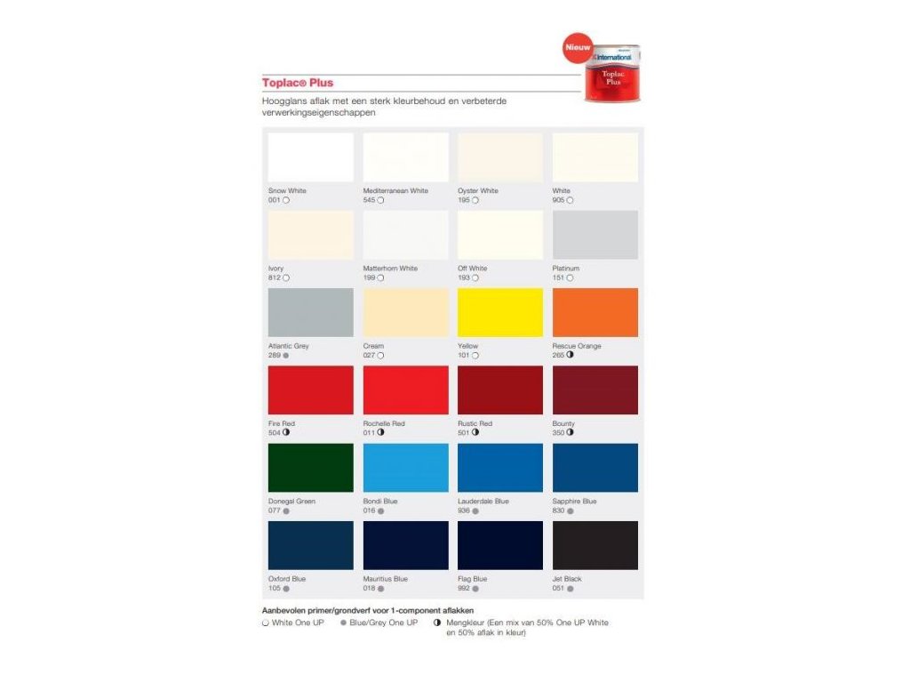 Toplac Plus je silikonový alkydový prémiový lesklý vrchní lak pro všechny typy podkladů nad čarou ponoru. Snadno se nanáší molitanovým válečkem. Toplac Plus obsahuje UV filtry pro zvýšenou odolnost. Vylepšená estetika oproti běžnému Toplacu, vylepšený obraz a barva. Vydatnost 12 m²/L. Určeno pro hliník, pozinkovanou ocel, laminát, olovo, ocel, dřevo, uhlíkové vlákno a litinu. Doporučené ředidlo č. 100. Doporučují se 1-2 vrstvy.